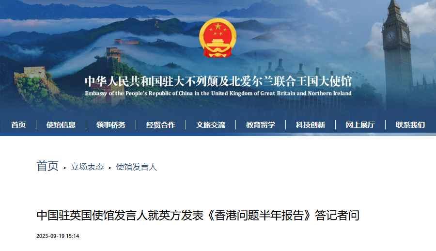香港新聞網9月20日電 據中國駐英國使館網站19日消息,使館發言人就英方發表《香港問題半年報告》答記者問。
