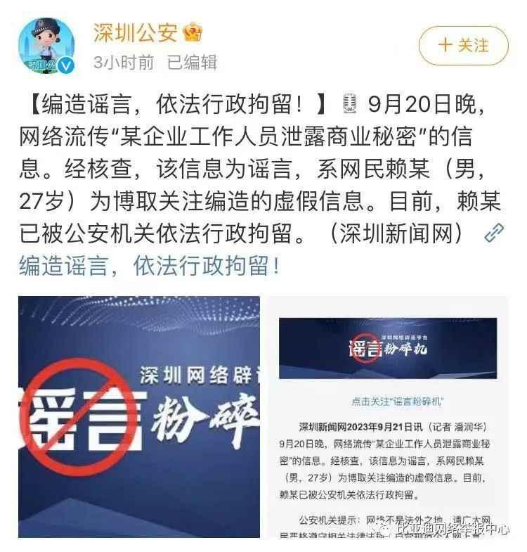 此前在網絡上流傳的謠言 比亞迪稱,網絡不是法外之地,誠摯呼籲廣大網友朋友們,不造謠、不傳謠,共同建設文明和諧健康向上的網絡環境。 此前,據深圳新聞網報道,9月20日晚,網絡流傳“比亞迪工作人員泄露商業秘密”的信息。經核查,該信息為謠言,系網民賴某(男,27歲)為博取關注編造的虛假信息。目前,賴某已被公安機關依法行政拘留。