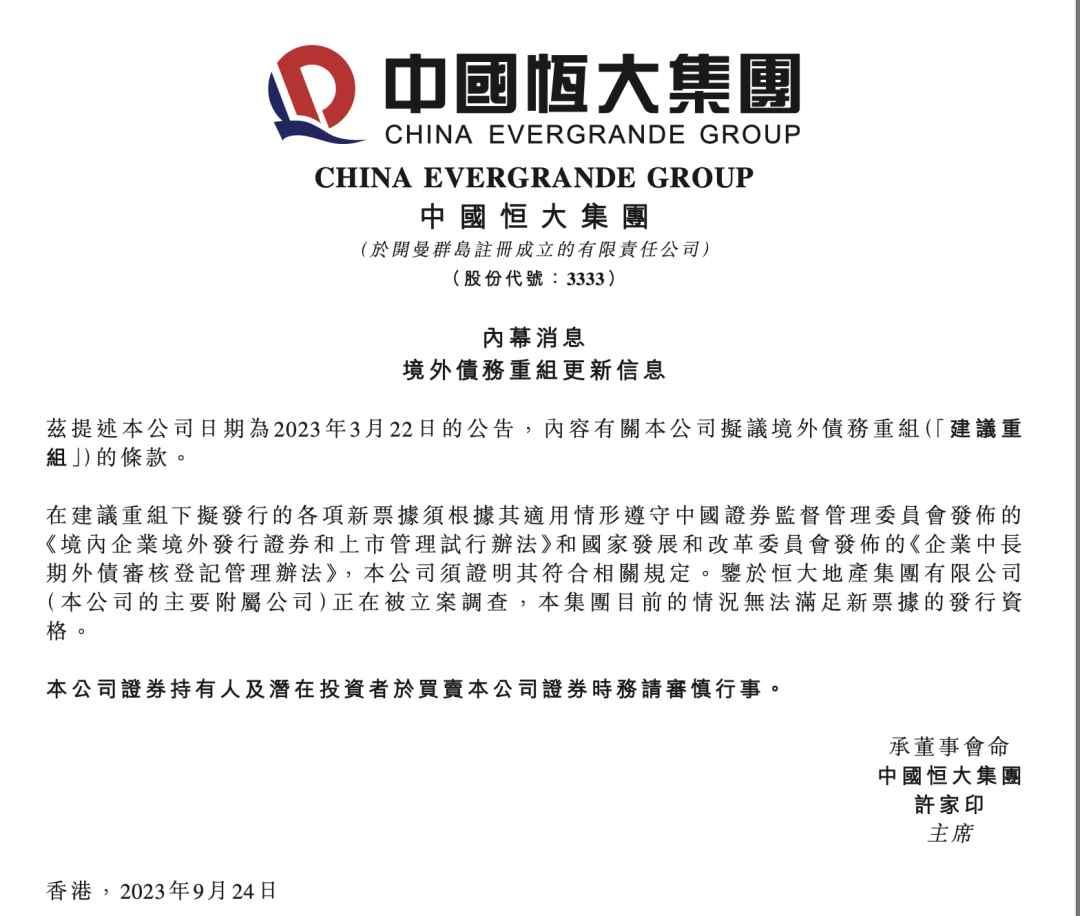 中國恒大:目前的情況無法滿足新票據的發行資格香港新聞網9月25日電 恒大境外債務重組又起波瀾! 9月24日,中國恒大發佈公告更新境外債務重組信息,公告稱,在建議重組下擬發行的各項新票據須根據其適用情形遵守中國證券監督管理委員會發佈的《境內企業境外發行證券和上市管理試行辦法》和國家發展和改革委員會發佈的《企業中長期外債審核登記管理辦法》,本公司須證明其符合相關規定 。 鑒於附屬公司恒大地產集團正在被立案調查 ,集團目前的情況無法滿足新票據的發行資格。