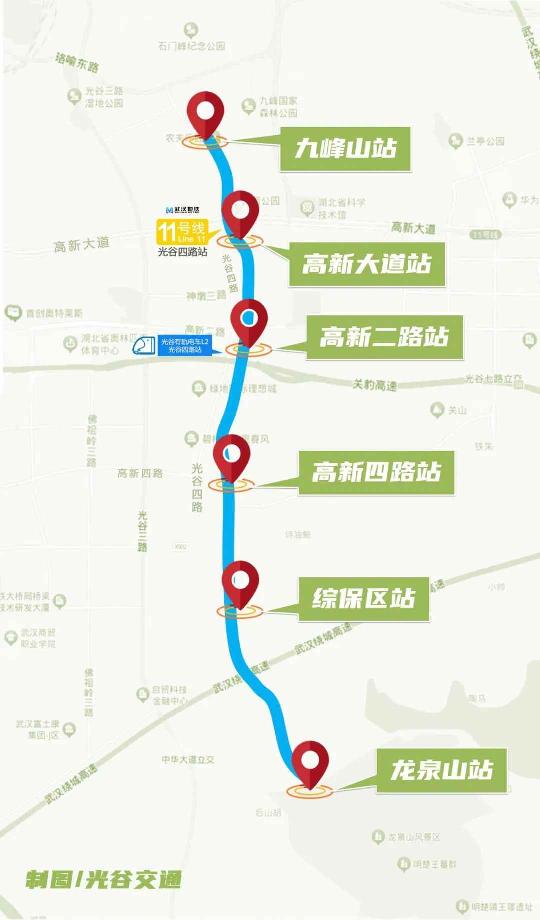 即日起,廣大遊客可通過線上、線下等多種途徑購票,並通過手機刷碼或刷臉進站上車,乘坐“光谷光子號”,盡情體驗“人在空中遊,景在窗外動”的科幻感,暢遊“一站一景,九橋相連,一橋一風光”。 目前,開通一期工程,線路全長10.5公里,共設6個站點。 空軌列車採用全自動無人駕駛模式運營,最高運行時速60公里,初期採用2節編組,最多能容納220餘人,同時可在2-3節車廂之間靈活編組,適應不同客流運輸需求。 初期運營時間:首、末班車為早8點至晚8點