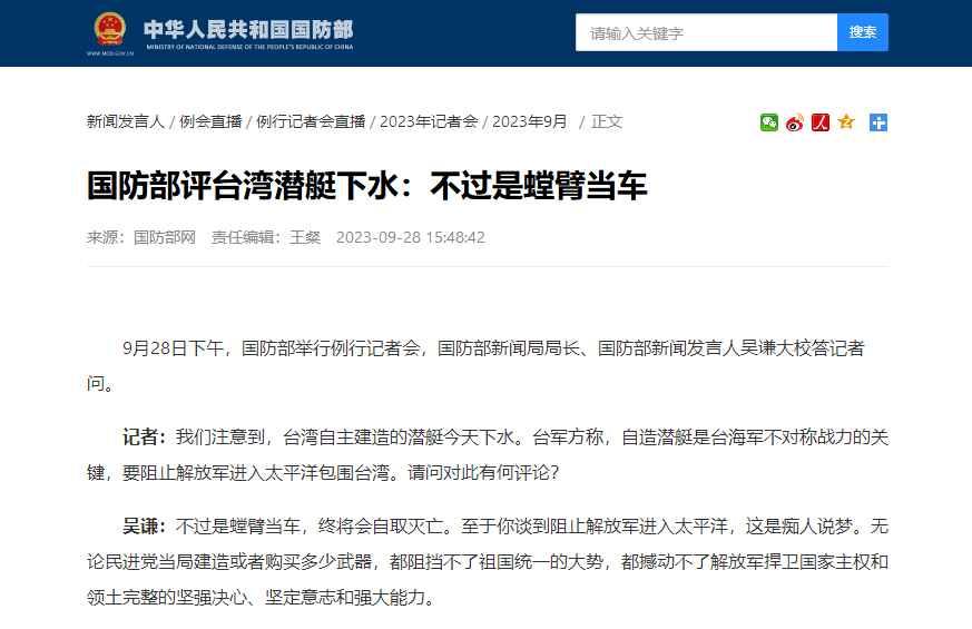 國防部評台灣潛艇下水:不過是螳臂當車,終將會自取滅亡分享到: