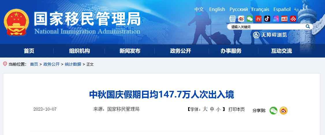 中秋國慶假期日均147.7萬人次出入境,較去年同期增長2.9倍分享到: