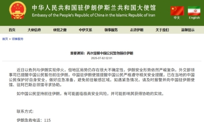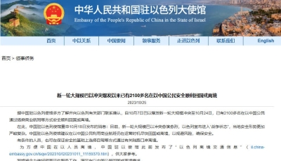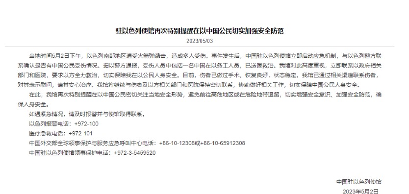 香港新聞網10月8日電 據中國駐以色列大使館微信公眾號“以館為家”消息,當地時間7日,以色列多地突遭火箭彈及武裝人員襲擊,造成較大人員傷亡。目前,有關事態仍在繼續發展中。中國駐以色列使館特此提醒在以中國公民密切關注當地安全形勢,切實增強安全意識,落實安全防範措施,確保安全。