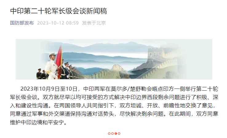 香港新聞網10月12日電 據“國防部發布”微信公眾號消息,2023年10月9日至10日,中印兩軍在莫爾多/楚舒勒會晤點印方一側舉行第二十輪軍長級會談。雙方就盡早以均可接受的方式解決中印邊界西段剩餘問題進行了積極、深入和建設性溝通。在兩國領導人共同指引下,雙方坦誠、開放、前瞻性地交換了意見,同意通過軍事和外交渠道保持溝通對話勢頭,盡快解決剩餘問題。在此期間,雙方同意維護中印邊境和平安寧。