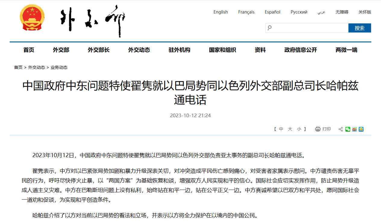 香港新聞網10月13日電 據中國外交部網站消息,10月12日,中國政府中東問題特使翟雋就以巴局勢同以色列外交部負責亞太事務的副總司長哈帕茲通電話。