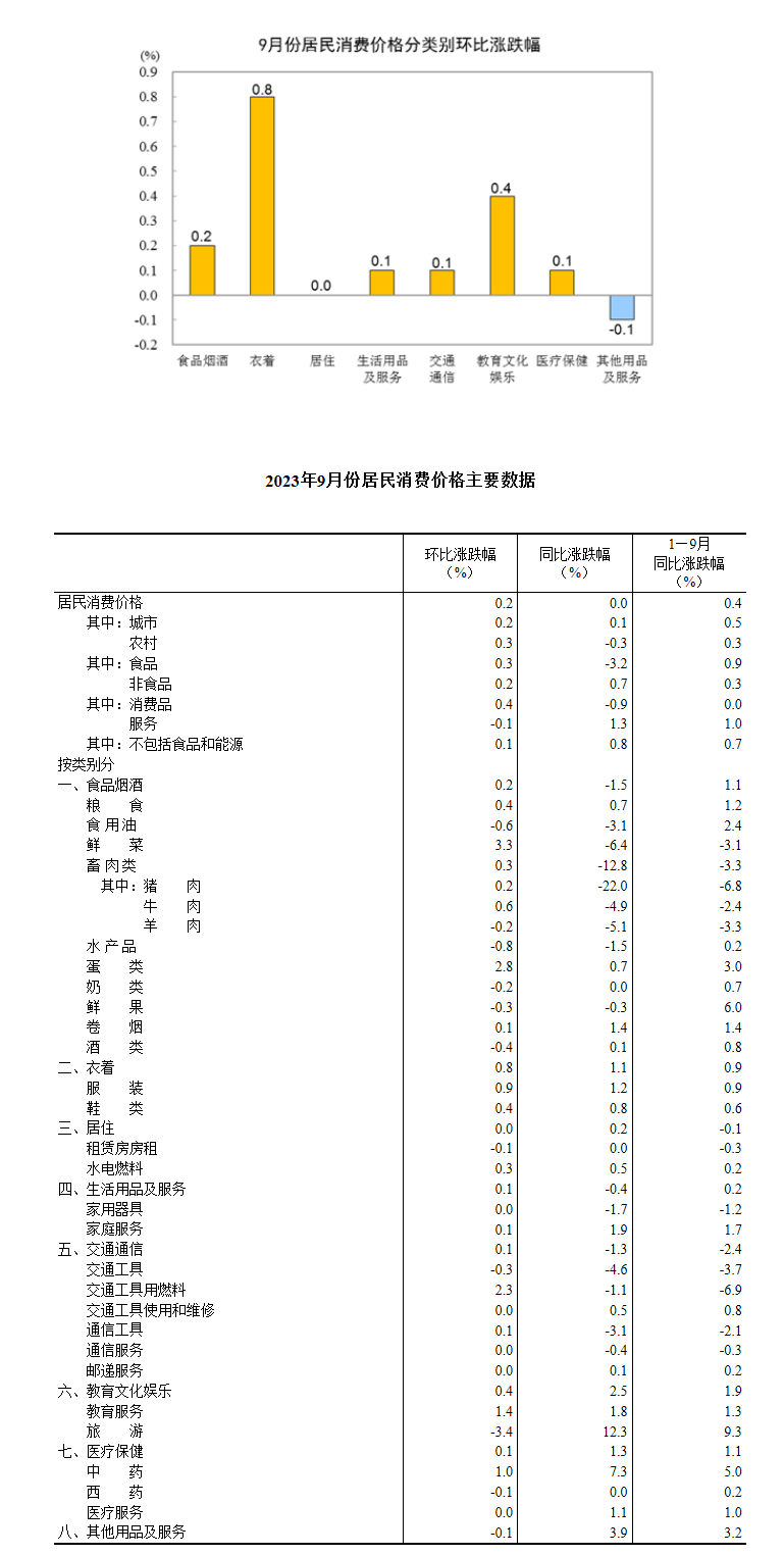 香港新聞網10月13日電 國家統計局網站10月13日消息,2023年9月份,全國居民消費價格同比持平。其中,城市上漲0.1%,農村下降0.3%;食品價格下降3.2%,非食品價格上漲0.7%;消費品價格下降0.9%,服務價格上漲1.3%。1—9月平均,全國居民消費價格比上年同期上漲0.4%。 9月份,全國居民消費價格環比上漲0.2%。其中,城市上漲0.2%,農村上漲0.3%;食品價格上漲0.3%,非食品價格上漲0.2%;消費品價格上漲0.4%,服務價格下降0.1%。