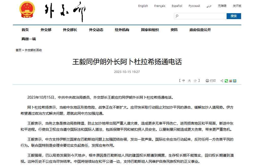 中國外交部網站截圖 阿卜杜拉希揚表示,當前中東地區形勢危險,戰爭正在不斷擴大,應盡快採取行動阻止對加沙平民的襲擊,緩解加沙人道局勢。伊方希望通過政治方式解決問題,願就此同中方加強溝通。 王毅表示,當務之急是推動局勢降溫,防止加沙地帶出現嚴重人道災難,造成更多無辜平民傷亡,進而損害地區和平局面,斷送中東和平進程。行使自衛權應當遵守國際法和國際人道法,包括保障平民和被扣押人員安全。以暴制暴只能造成更大傷害,帶來更嚴重危機。 王毅表示,中方支持伊斯蘭國家在巴勒斯坦問題上加強團結協調,發出一致聲音。國際社會應當行動起來,反對任何一方傷害平民的行為。聯合國特別是安理會要切實負起責任,發揮應有作用。 王毅強調,巴以局勢發展到今天地步,根本原因是巴勒斯坦人民的建國權長期遭到擱置,生存權長期不能落實,回歸權長期遭到漠視。這種歷史不公應當盡快結束。中國將繼續站在和平公道一邊,支持巴勒斯坦人民維護自身民族權利的正義事業。(完) 【編輯:丘志彬】