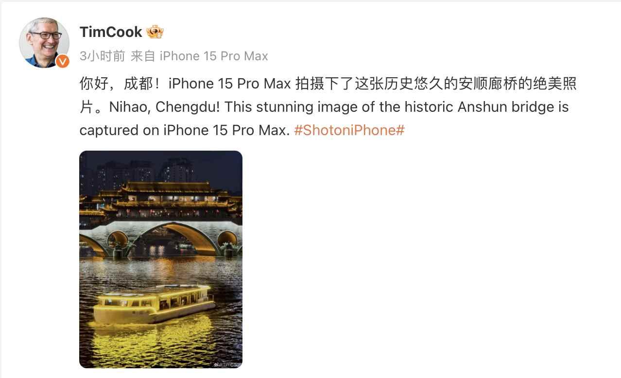 10月16日,蘋果公司CEO庫克在個人微博宣佈到訪成都,並附上一張由iPhone15 Pro Max拍攝的安順廊橋照片。