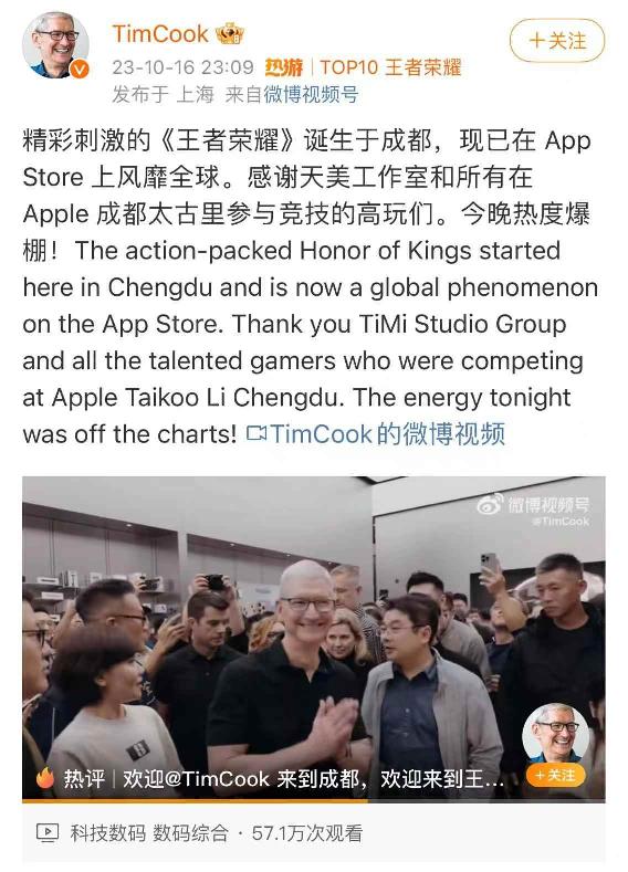10月16日23點9分,蘋果CEO庫克再次更新了微博,庫克現身成都太古里。據悉,庫克在蘋果旗艦店圍觀了一場王者榮耀表演賽。庫克在微博中發佈視頻,並提及,“精彩刺激的《王者榮耀》誕生於成都,現已在App Store上風靡全球。”