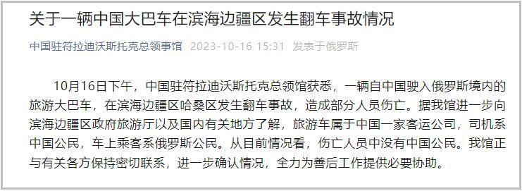 香港新聞網10月17日電 據“中國駐符拉迪沃斯托克總領事館”公眾號消息,10月16日下午,中國駐符拉迪沃斯托克總領館獲悉,一輛自中國駛入俄羅斯境內的旅遊大巴車,在濱海邊疆區哈桑區發生翻車事故,造成部分人員傷亡。 據中國駐符拉迪沃斯托克總領事館進一步向濱海邊疆區政府旅遊廳以及國內有關地方了解,旅遊車屬於中國一家客運公司,司機系中國公民,車上乘客系俄羅斯公民。從目前情況看,傷亡人員中沒有中國公民。 中國駐符拉迪沃斯托克總領事館正與有關各方保持密切聯繫,進一步確認情況,全力為善後工作提供必要協助。