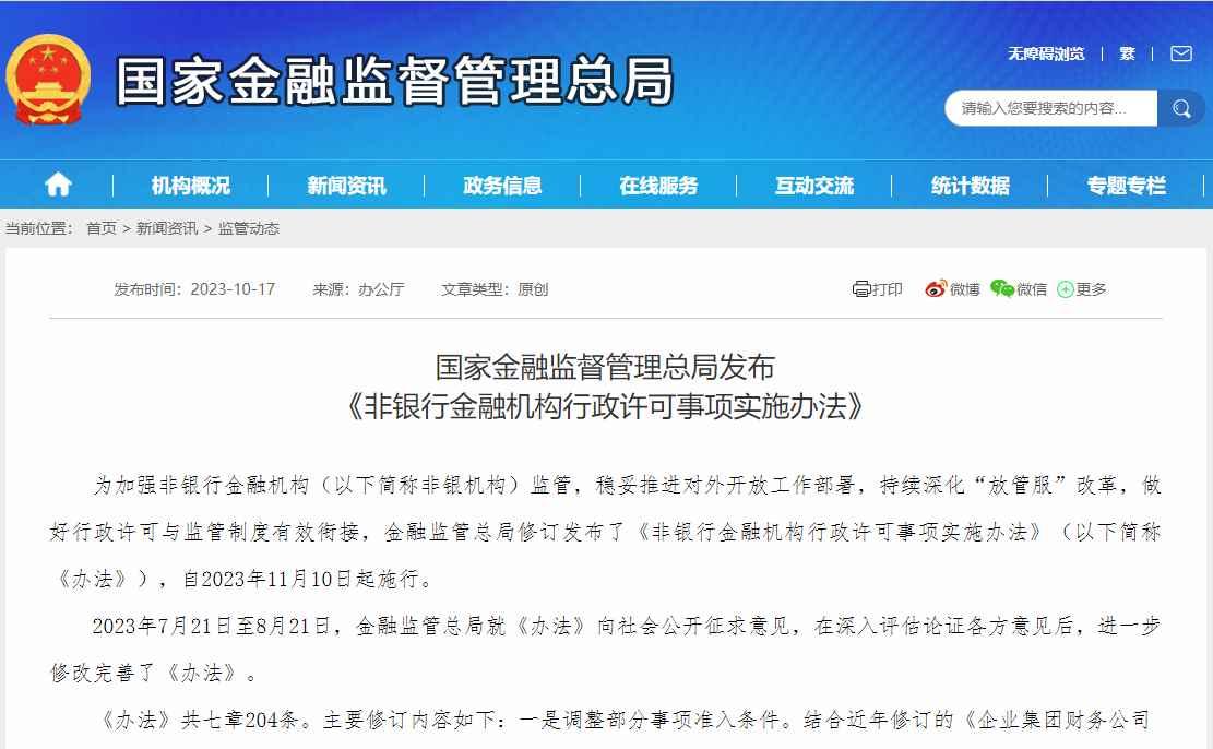香港新聞網10月18日電 據國家金融監督管理總局網站17日消息,為加強非銀行金融機構(以下簡稱非銀機構)監管,穩妥推進對外開放工作部署,持續深化“放管服”改革,做好行政許可與監管制度有效銜接,金融監管總局修訂發佈了《非銀行金融機構行政許可事項實施辦法》(以下簡稱《辦法》),自2023年11月10日起施行。