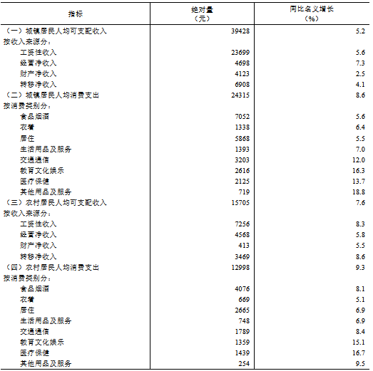 香港新聞網10月18日電 國家統計局網站10月18日公佈2023年前三季度居民收入和消費支出情況。 一、居民收入情況 前三季度,全國居民人均可支配收入29398元,比上年同期名義增長6.3%,扣除價格因素,實際增長5.9%。分城鄉看,城鎮居民人均可支配收入39428元,增長(以下如無特別說明,均為同比名義增長)5.2%,扣除價格因素,實際增長4.7%;農村居民人均可支配收入15705元,增長7.6%,扣除價格因素,實際增長7.3%。 按收入來源分,前三季度,全國居民人均工資性收入16747元,增長6.8%,佔可支配收入的比重為57.0%;人均經營凈收入4643元,增長6.7%,佔可支配收入的比重為15.8%;人均財產凈收入2554元,增長3.7%,佔可支配收入的比重為8.7%;人均轉移凈收入5454元,增長5.8%,佔可支配收入的比重為18.6%。 前三季度,全國居民人均可支配收入中位數24528元,增長5.4%,中位數是平均數的83.4%。其中,城鎮居民人均可支配收入中位數35242元,增長4.3%,中位數是平均數的89.4%;農村居民人均可支配收入中位數13396元,增長5.7%,中位數是平均數的85.3%。 圖1 2023年前三季度全國及分城鄉居民人均可支配收入與增速