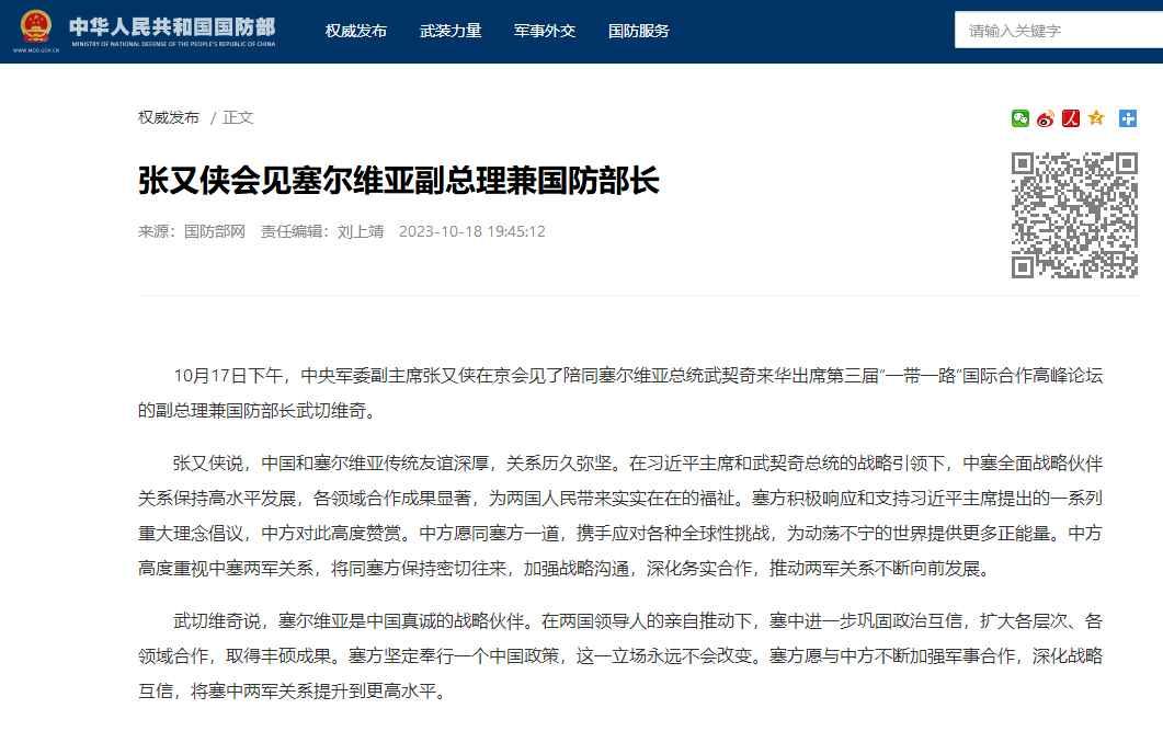 香港新聞網10月19日電 據中國國防部網站18日消息,10月17日下午,中央軍委副主席張又俠在京會見了陪同塞爾維亞總統武契奇來華出席第三屆“一帶一路”國際合作高峰論壇的副總理兼國防部長武切維奇。