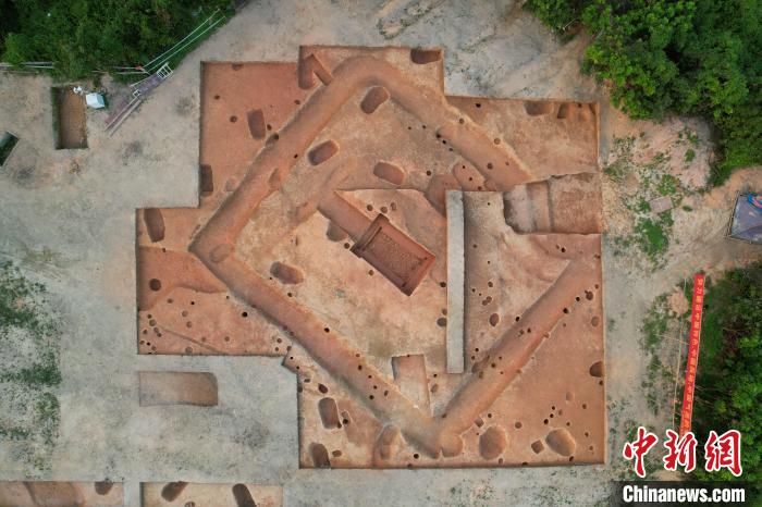 鑊蓋頂嶺M1墓葬航拍圖。廣州市文物考古研究院供圖 2023年9月至10月,經報國家文物局同意,廣州市文物考古研究院對鑊蓋頂嶺遺址進行了考古發掘工作,共揭露面積700平方米,在鑊蓋頂嶺崗丘頂部發現四周有圍溝的西漢南越國時期的大型越人墓葬一座(編號M1)。該墓獨占鑊蓋頂嶺,圍溝東西長18.6米,墓坑底用小石塊鋪墊成石床,上置木槨。 同時,塋域外圍西部和南部還分佈有比較密集的柱洞,推測可能當時還存在“墓祭”的地面建築,這些跡象都表明墓主人身份等級不低。