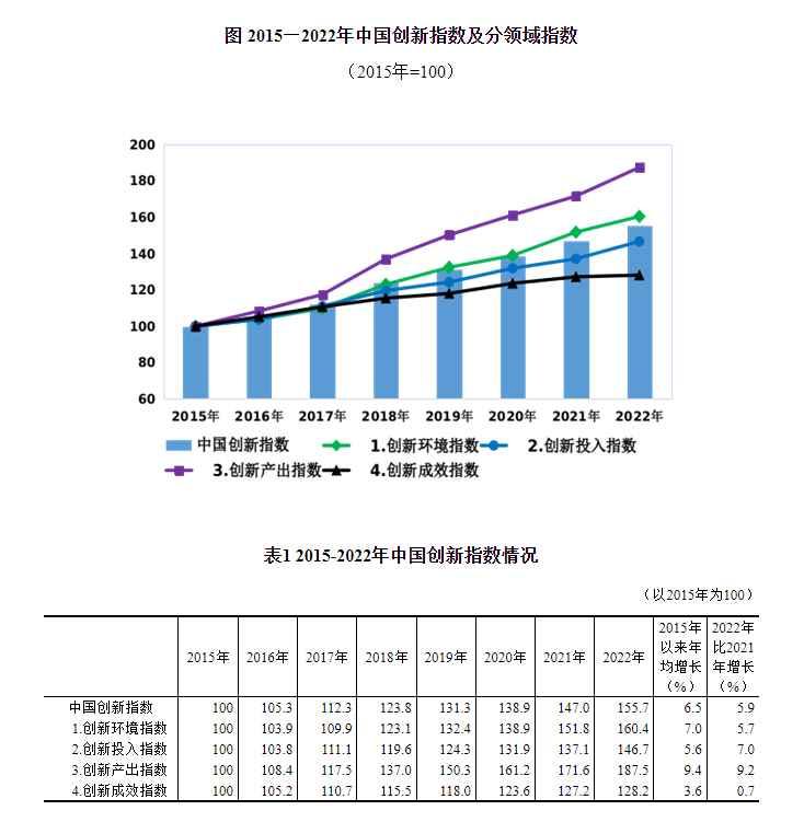 國家統計局:2022年中國創新指數比上年增長5.9%香港新聞網10月20日電 據中國國家統計局網站消息,國家統計局社科文司《中國創新指數研究》課題組完善了中國創新指數編制方法並進行了測算。結果表明,中國創新能力較快提升,創新發展新動能加速聚集,為推動高質量發展提供了強大動力。 一、中國創新能力較快提升 測算結果顯示,以2015年為基期,2022年中國創新指數為155.7,4個分領域指數創新環境指數、創新投入指數、創新產出指數和創新成效指數分別為160.4、146.7、187.5和128.2。與2015年相比,中國創新指數年均增長6.5%,比同期國內生產總值(GDP)增速快0.8個百分點;4個分領域指數年均增速分別為7.0%、5.6%、9.4%和3.6%。與2021年相比,中國創新指數增長5.9%,4個分領域指數分別增長5.7%、7.0%、9.2%和0.7%(詳見表1)。