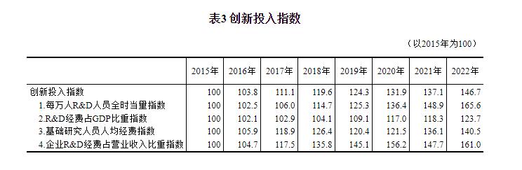 三、創新投入穩步提高 “創新投入”領域包括每萬人研究與試驗發展(R&D,下同)人員全時當量、R&D經費佔GDP比重、基礎研究人員人均經費、企業R&D經費佔營業收入比重等4個指標。 以2015年為100,2022年中國創新投入指數為146.7,年均增長5.6%。分指標看,每萬人R&D人員全時當量指數增長相對較快,年均增速為7.5%,2022年指數值為165.6;企業R&D經費佔營業收入比重指數、基礎研究人員人均經費指數、R&D經費佔GDP比重指數的年均增速分別為7.0%、5.0%和3.1%,2022年指數值相應為161.0、140.5和123.7(詳見表3)。