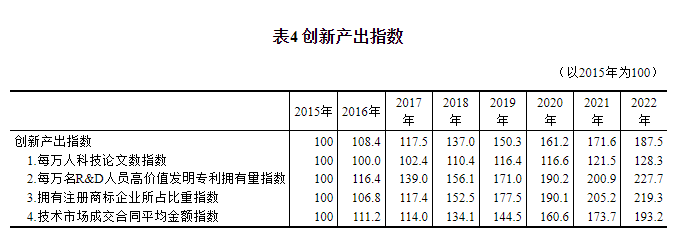 四、創新產出大幅增加 “創新產出”領域包括每萬人科技論文數、每萬名R&D人員高價值發明專利擁有量、擁有註冊商標企業所佔比重、技術市場成交合同平均金額等4個指標。 以2015年為100,2022年中國創新產出指數為187.5,年均增長9.4%。分指標看,每萬名R&D人員高價值發明專利擁有量指數、擁有註冊商標企業所佔比重指數實現大幅提升,年均增速分別達12.5%和11.9%,2022年指數值分別為227.7和219.3,在全部18個指標中位列第二和第三;技術市場成交合同平均金額指數增長也較快,年均增速為9.9%,2022年指數值為193.2;每萬人科技論文數指數年均增速為3.6%,2022年指數值為128.3(詳見表4)。