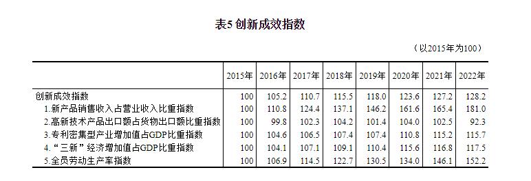 五、創新成效進一步顯現 “創新成效”領域包括新產品銷售收入佔營業收入比重、高新技術產品出口額佔貨物出口額比重、專利密集型產業增加值佔GDP比重、“三新”經濟增加值佔GDP比重、全員勞動生產率等5個指標。 以2015年為100,2022年中國創新成效指數為128.2,年均增長3.6%。分指標看,新產品銷售收入佔營業收入比重指數增長相對較快,年均增速為8.8%,2022年指數值為181.0;全員勞動生產率指數、“三新”經濟增加值佔GDP比重指數、專利密集型產業增加值佔GDP比重指數、高新技術產品出口額佔貨物出口額比重指數的年均增速分別為6.2%、2.3%、2.1%和-1.1%,2022年指數值相應為152.2、117.5、115.7和92.3(詳見表5)。