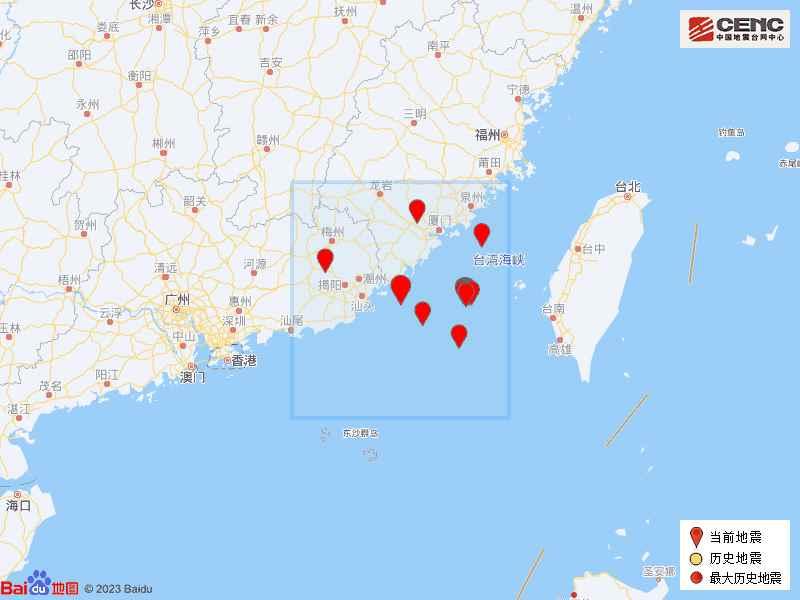根據中國地震台網速報目錄,震中周邊200公里內近5年來發生3級以上地震共23次,最大地震是2018年11月26日在台灣海峽發生的6.2級地震(距離本次震中124公里),歷史地震分布如圖。