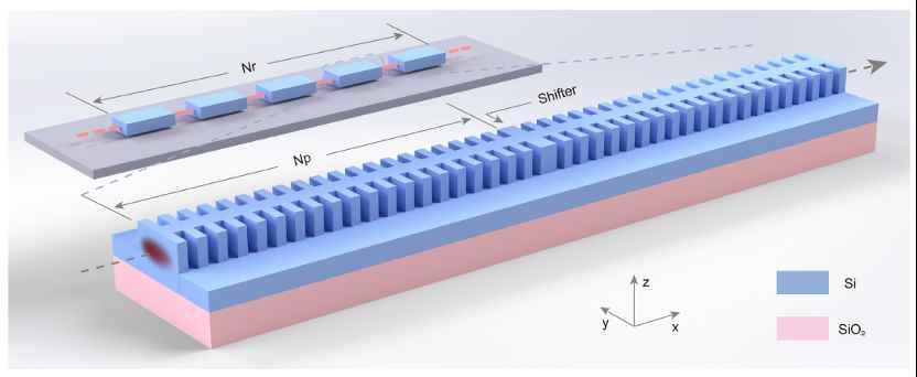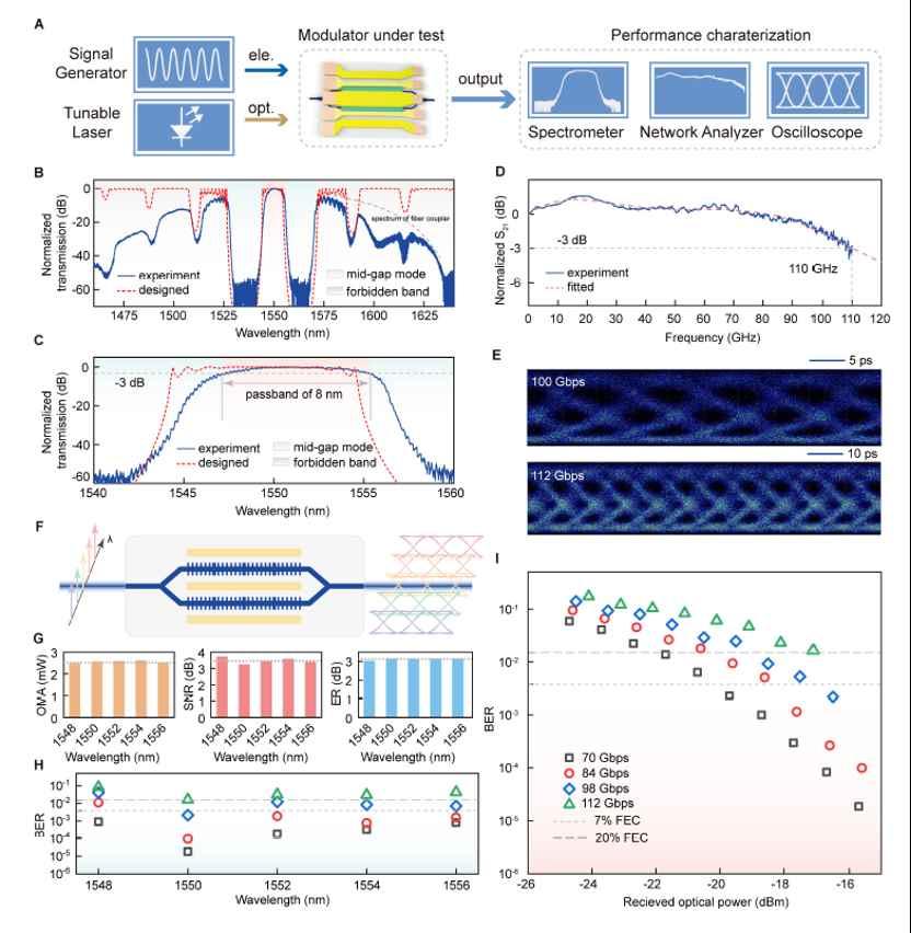 基於慢光效應的硅基調製結構。圖自北京大學電子學院網站 在本次工作中,研究團隊針對傳統硅基調製器帶寬受限問題,利用硅基藕合諧振腔光波導結構引入慢光效應,構建了完整的硅基慢光調製器理論模型,通過合理調控結構參數以綜合平衡光學與電學指標因素,實現對調製器性能的深度優化。研究團隊基於CMOS集成工藝兼容的硅基光電子標準工藝,在純硅材料體系下設計並製備了在1550納米左右通信波長下工作的超高帶寬硅基慢光調製器,實現了110GHz的超高電光帶寬,打破了迄今為止純硅調製器的帶寬上限,並同時將調製臂尺寸縮短至百微米數量級,在無須數字信號處理的情況下以簡單的二進製振幅鍵控調製格式實現了單通道超過110Gbps的高速信號傳輸,降低了算法成本與信號延遲,同時在寬達8納米的超大光學通帶內保持多波長通信性能的高度均一性。