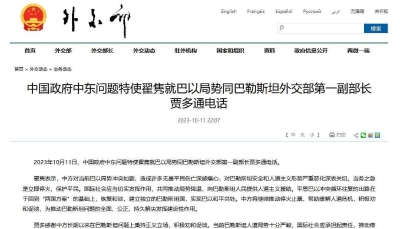 香港中通社10月23日電 據中國外交部10月23日消息,10月22日,中國政府中東問題特使翟雋在訪問埃及並出席巴勒斯坦問題開羅和平峰會期間,會見埃及外交部巴勒斯坦事務部長助理烏薩瑪。