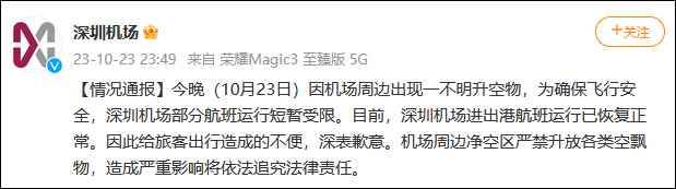 香港新聞網10月24日電 @深圳機場 10月23日發佈情況通報稱,當天晚間,因機場周邊出現一不明升空物,為確保飛行安全,深圳機場部分航班運行短暫受限。目前,深圳機場進出港航班運行已恢復正常。因此給旅客出行造成的不便,深表歉意。機場周邊凈空區嚴禁升放各類空飄物,造成嚴重影響將依法追究法律責任。