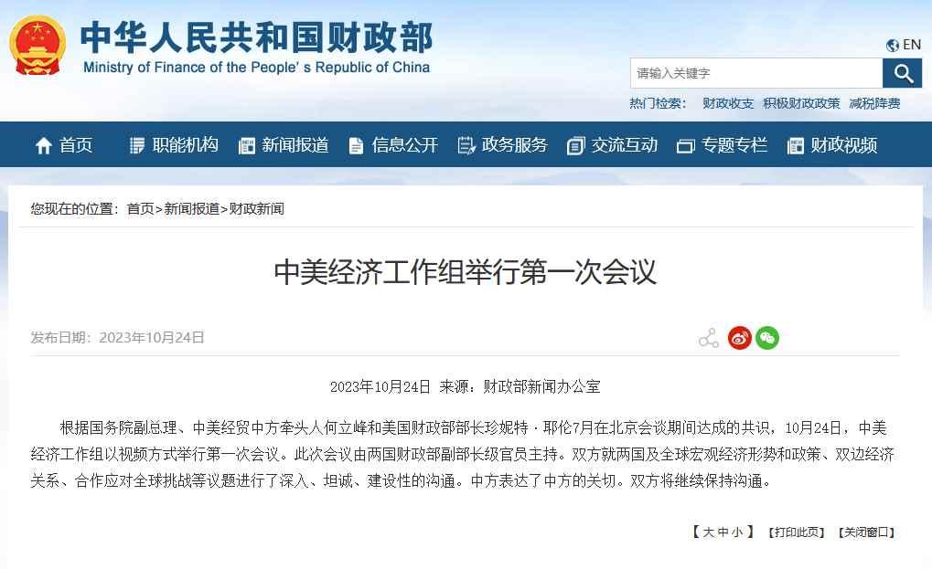 香港新聞網10月24日電 據中國財政部網站消息,根據國務院副總理、中美經貿中方牽頭人何立峰和美國財政部部長珍妮特·耶倫7月在北京會談期間達成的共識,10月24日,中美經濟工作組以視頻方式舉行第一次會議。此次會議由兩國財政部副部長級官員主持。雙方就兩國及全球宏觀經濟形勢和政策、雙邊經濟關係、合作應對全球挑戰等議題進行了深入、坦誠、建設性的溝通。中方表達了中方的關切。雙方將繼續保持溝通。