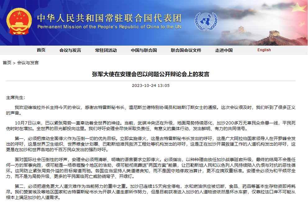 中國駐聯合國代表團網站截圖 張軍在安理會巴以問題公開辯論會上表示,面對國際社會壓倒性的呼聲,安理會必須用清晰、明確的語言要求立即停火。以種種理由放任加沙地帶戰事延宕升級,最終的結局不會是任何一方的軍事完勝,很可能是一場吞噬整個地區的浩劫,很可能徹底葬送“兩國方案”前景,讓巴勒斯坦人民和以色列人民持續陷入仇恨與對抗的惡性循環。這同防止緊張局勢外溢的目標背道而馳。各國應當堅持人類道德良知,而不是固守地緣政治算計,更不應搞雙重標準。 張軍說,加沙地帶已連續15天完全停電,水和燃油供應被切斷,食品、藥品等基本生存物資即將耗盡。目前獲准進入加沙地帶的人道物資依然是杯水車薪,僅靠拉法口岸不可能從根本上滿足加沙地帶的人道需求。安理會應當以最明確的語言要求佔領方立即解除對加沙地帶的全面封鎖,恢復水、電、燃料供應,停止對加沙地帶民眾的集體懲罰。中方呼籲以色列為拉法口岸正常運轉創造有利條件,停止對其周邊地區的空襲,保證救援通道暢通。 張軍說,巴以新一輪衝突導致的平民傷亡觸目驚心。安理會必須堅決捍衛國際法治,明確譴責一切針對平民的暴力和襲擊,明確反對任何違反國際法的做法。中方呼籲開展外交努力,讓被扣押人員盡早獲釋。無差別使用武力不可接受,醫院、學校等民用設施不應該、也不允許成為軍事行動的目標,聯合國工作人員、人道及醫務工作者的安全必須得到保障。中方呼籲徹查加沙城醫院遭襲並造成重大平民傷亡事件。中方反對針對加沙地帶民眾的強迫流離失所和強制遷移,敦促以色列履行國際人道法義務,立即撤銷加沙地帶北部緊急疏散令。 張軍表示,巴以衝突的根源在於巴勒斯坦的領土長期被非法佔領,巴勒斯坦人民獨立建國的權利被長期忽視,巴勒斯坦民眾的基本權利長期沒有得到根本保障。解決巴以衝突的根本之策是落實“兩國方案”,實現巴勒斯坦和以色列和平共處。 張軍強調,中方在巴勒斯坦問題上沒有任何私利,只要有利於和平,中方都將堅定支持,只要有助於巴以和解,中方都會盡力而為。中方將繼續站在國際公平正義一邊,站在國際法一邊,站在廣大阿拉伯和伊斯蘭國家正當訴求一邊,繼續同國際社會一道,為推動巴勒斯坦問題早日得到全面公正持久解決作出不懈努力。(完) 【編輯:丘志彬】