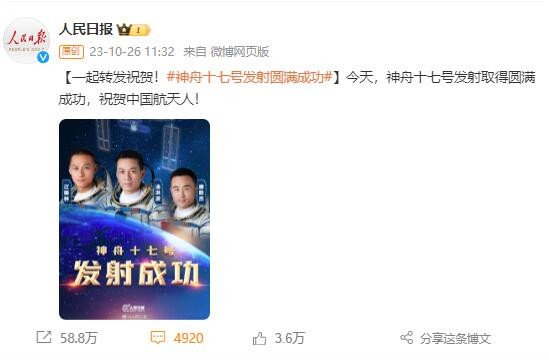 神舟十七號航天員湯洪波(中)、唐勝傑(右)、江新林 10月26日11時14分,搭載神舟十七號載人飛船的長征二號F遙十七運載火箭在酒泉衛星發射中心點火發射,約10分鐘後,神舟十七號載人飛船與火箭成功分離,進入預定軌道,航天員乘組狀態良好,發射取得圓滿成功! 同一時間,在社交媒體上,眾多媒體紛紛發文表示祝賀,祝賀中國航天人,祝賀神舟十七號發射圓滿成功!
