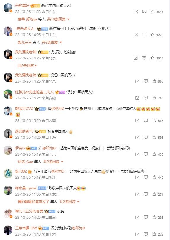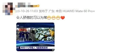 香港新聞網10月27日電 “3、2、1,點火、起飛!”10月26日11時14分,伴隨著一陣響徹雲霄的轟鳴聲,神舟十七號載人飛船在東風航天城挾烈焰騰空而起。這一次,又是圓滿成功!至此,中國載人航天發射已經取得“30戰30捷”的成績!在社交媒體上,眾多中國網友紛紛表示祝賀,給中國航空點贊,更有網友自豪地留言道:“有一種驕傲叫習以為常!”