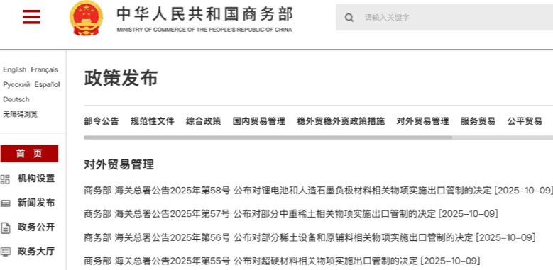 中國商務部新聞發言人束玨婷。中國商務部網站 據中國商務部消息,束玨婷在例行記者會上說,商務部會同海關總署上周五(10月20日)發佈優化調整石墨物項臨時出口管制措施的公告。管制物項有進有出,其中3種高敏感石墨物項正式列入管制清單。同時5種低敏感石墨物項取消臨時管制。 束玨婷表示,中國政府依法實施出口管制,正常調整,不針對任何特定國家和地區,也不針對任何特定產業。中國始終致力於保障全球產業鏈、供應鏈安全穩定,出口符合相關規定的將予以許可。 據中國商務部和海關總署的公告,12月1日起將此前實施臨時管制的高敏感石墨制品正式納入出口管制清單,規定高純度、高強度、高密度的人造石墨材料及其制品,以及包括球化石墨、膨脹石墨在內的天然鱗片石墨及其制品,未經許可不得出口。 中國是世界最大石墨生產和出口國,占全球總供應量超過65%,主要出口韓國、日本、美國、印度。此次納入出口管制的人造石墨是鋰電池負極的重要材料,全球超過90%的動力電池負極材料由中國生產。(完) 【編輯:馬華】