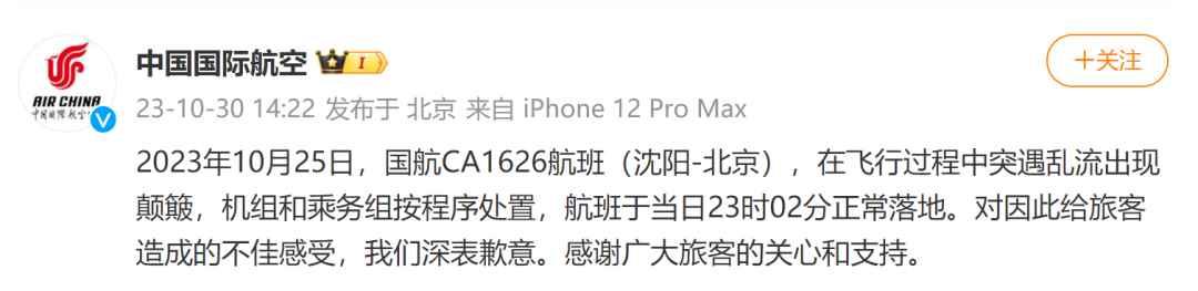 國航CA1626航班飛行途中突遇亂流出現顛簸,國航致歉分享到: