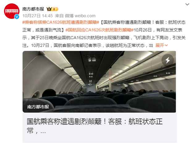 @中國國際航空 微博截圖 據南方都市報報道,此前有網友發文表示,其於25日晚乘坐國航CA1626次航班時出現強烈顛簸,飛機劇烈上下晃動,引發關注。27日,國航客服向記者表示,該趟航班為正常狀態,出現顛簸可能是飛行過程中遇到氣流,與飛機本身無關。