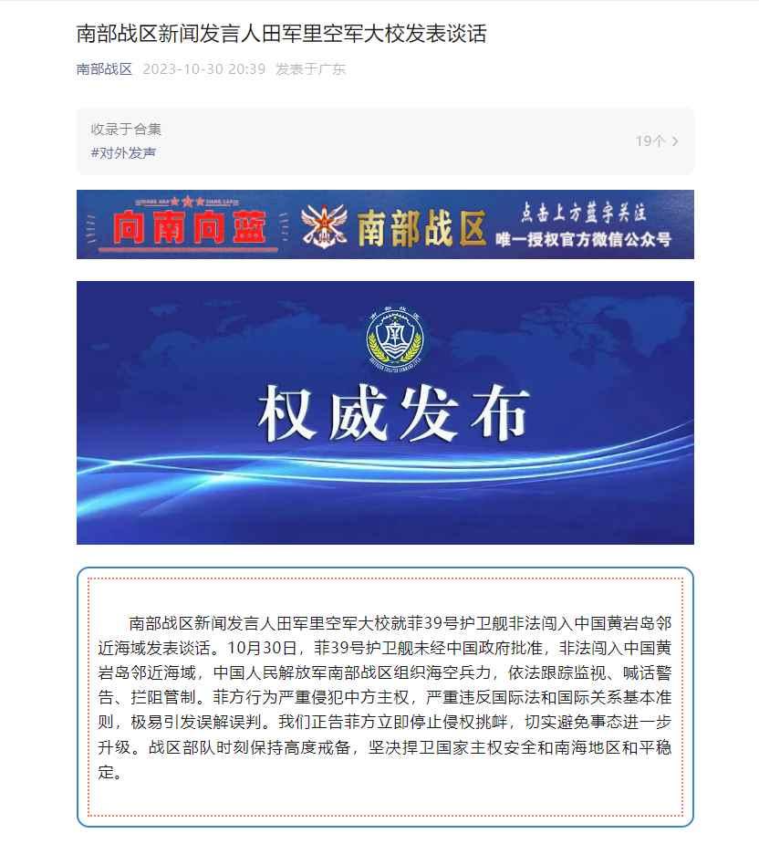 據微信公眾號“南部戰區”消息,田軍里表示,10月30日,菲39號護衛艦未經中國政府批准,非法闖入中國黃岩島鄰近海域,中國人民解放軍南部戰區組織海空兵力,依法跟蹤監視、喊話警告、攔阻管制。 田軍里指出,菲方行為嚴重侵犯中方主權,嚴重違反國際法和國際關係基本準則,極易引發誤解誤判。我們正告菲方立即停止侵權挑釁,切實避免事態進一步升級。 田軍里強調,戰區部隊時刻保持高度戒備,堅決捍衛國家主權安全和南海地區和平穩定。(完) 【編輯:丘志彬】