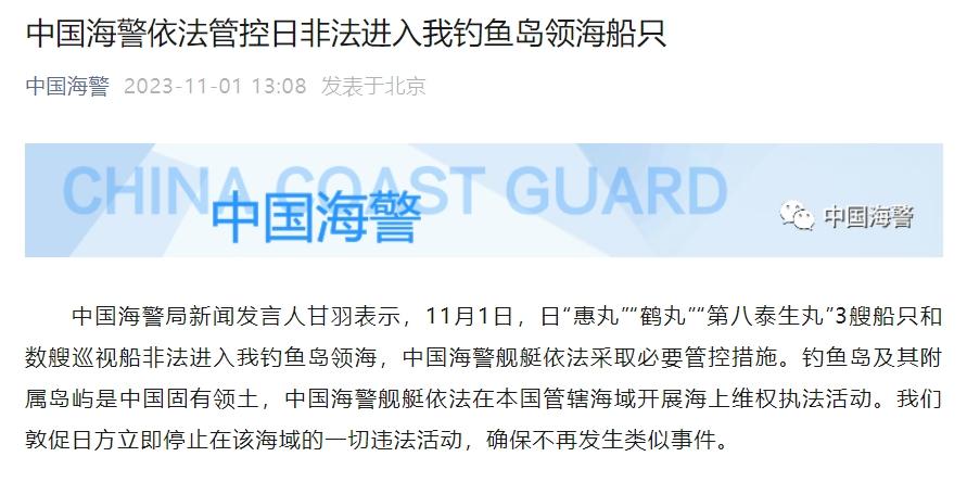 香港新聞網11月1日電 據中國海警微博消息,中國海警局新聞發言人甘羽表示,11月1日,日“惠丸”“鶴丸”“第八泰生丸”3艘船隻和數艘巡視船非法進入我釣魚島領海,中國海警艦艇依法採取必要管控措施。釣魚島及其附屬島嶼是中國固有領土,中國海警艦艇依法在本國管轄海域開展海上維權執法活動。我們敦促日方立即停止在該海域的一切違法活動,確保不再發生類似事件。
