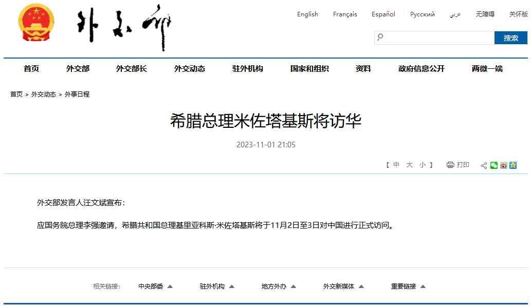 香港新聞網11月2日電 中國外交部發言人汪文斌11月1日宣佈,應中國國務院總理李強邀請,希臘共和國總理基里亞科斯·米佐塔基斯將於11月2日至3日對中國進行正式訪問。