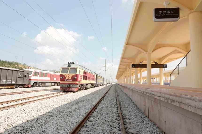 綜合檢測列車駛入東興市站。盧詩宇攝 線路自防城港北站南端引出,向西南至東興市站,途經防城港市江山鄉、東興市江平鎮,只有防城港北站、東興市站2座車站。 全長46.9公里,橋隧比為68%,設計時速200公里,基礎設施預留時速250公里條件。 防東鐵路2019年3月開工建設,預計今年底開通運營,防城港至東興通行時間由目前公路運輸的60分鐘縮短至20分鐘左右。從廣西首府南寧坐動車出發,只需70分鐘左右,即可直抵東興市。 東興市因興起於北侖河東岸而得名,距離南寧188公里,距離越南首都河內308公里。(完) 【編輯:丘志彬】