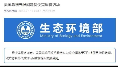香港新聞網11月3日電 據微信公眾號“生態環境部”2日消息,經中美雙方商定,中國氣候變化事務特使解振華將於11月4—7日與美國總統氣候問題特使克里在美國加利福尼亞州進行會談。雙方將圍繞推進應對氣候變化行動與合作、支持聯合國氣候變化迪拜大會成功等深入交換意見。