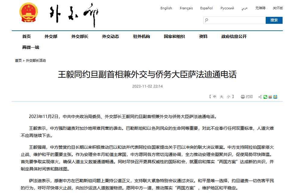 香港新聞網11月3日電 據中國外交部網站消息,2023年11月2日,中共中央政治局委員、外交部長王毅同約旦副首相兼外交與僑務大臣薩法迪通電話。