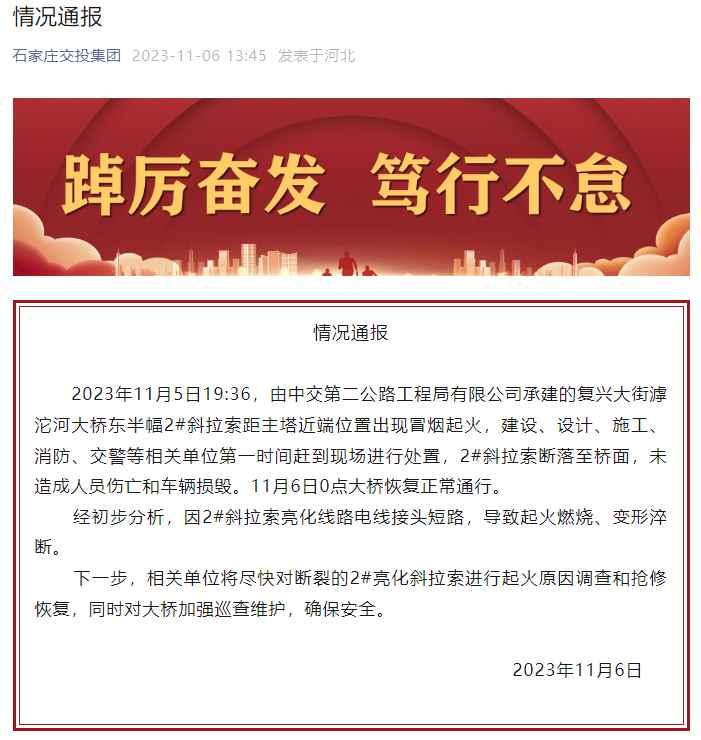 網傳視頻截圖 石家莊交投集團微信公眾號11月6日發佈情況通報,11月5日19:36,由中交第二公路工程局有限公司承建的復興大街滹沱河大橋東半幅2#斜拉索距主塔近端位置出現冒煙起火,建設、設計、施工、消防、交警等相關單位第一時間趕到現場進行處置,2#斜拉索斷落至橋面,未造成人員傷亡和車輛損毀。11月6日0點大橋恢復正常通行。 經初步分析,因2#斜拉索亮化線路電線接頭短路,導致起火燃燒、變形淬斷。 下一步,相關單位將盡快對斷裂的2#亮化斜拉索進行起火原因調查和搶修恢復,同時對大橋加強巡查維護,確保安全。