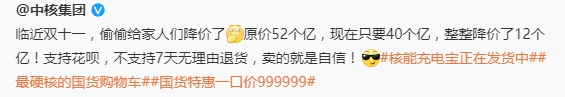 核反應堆上架淘寶?這批“硬核中國貨”最近火了……香港新聞網11月7日電 這可能是今年中國“雙十一”最豪橫的店鋪,別的商家賣鋰電池充電寶,“國資小新”直接上架核反應堆,還戲稱這是“移動核能充電寶”,除此之外還有一批“硬核國貨”上架,如直-20多用途直升機、太行110重型燃氣輪機……有中國網民就表示,這樣的國貨給我來一打!