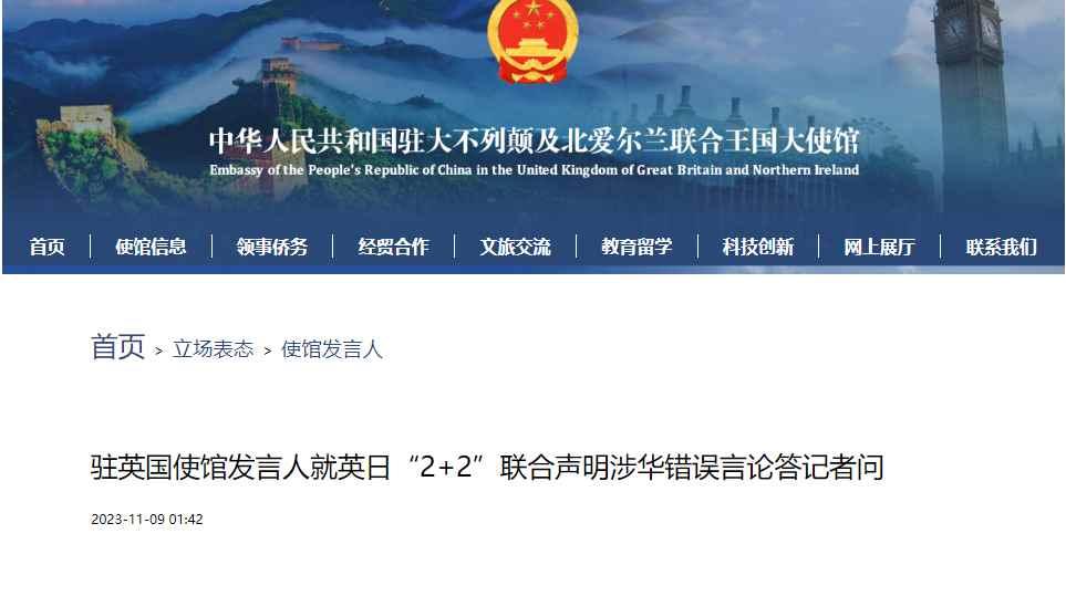 香港新聞網11月9日電 據中國駐英國大使館網站11月9日消息,中國駐英國使館發言人就英日“2+2”聯合聲明涉華錯誤言論答記者問。