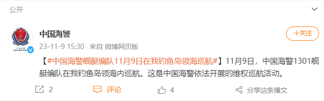 香港新聞網11月9日電 據中國海警局官方微博消息,11月9日,中國海警1301艦艇編隊在我釣魚島領海內巡航。這是中國海警依法開展的維權巡航活動。