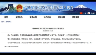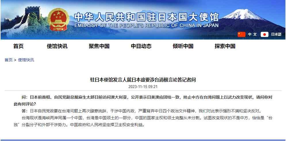 中國駐日本大使館網站截圖 問:日本前首相、自民黨副總裁麻生太郎日前訪問澳大利亞,公開表示日美澳應團結一致,防止中方在台灣問題上以武力改變現狀。請問你對此有何評論? 答:日本自民黨政要在台灣問題上再次肆意挑釁,干涉中國內政,嚴重背棄中日四個政治文件精神,我們對此表示強烈不滿和堅決反對。 台海現狀是海峽兩岸同屬一個中國,台灣是中國領土的一部分,中國的國家主權和領土完整從未分割。試圖改變現狀的不是中方,恰恰是“台獨”分裂分子和外部干涉勢力。中國政府和人民將堅定捍衛主權安全利益。 【編輯:丘志彬】