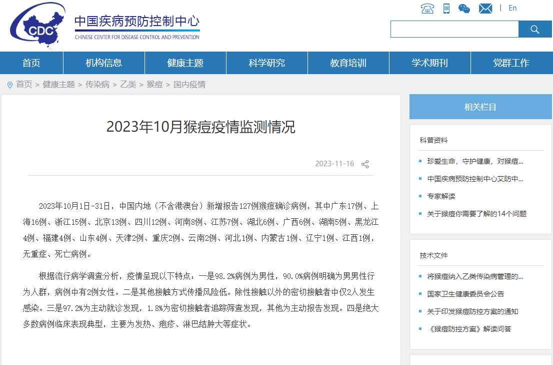 中國疾控中心網站截圖 其中廣東17例、上海16例、浙江15例、北京13例、四川12例、河南8例、江蘇7例等,無重症、死亡病例。 根據流行病學調查分析,疫情呈現以下特點:一是98.2%病例為男性,90%病例明確為男男性行為人群,病例中有2例女性。二是其他接觸方式傳播風險低。除性接觸以外的密切接觸者中僅2人發生感染。三是97.2%為主動就診發現,1.8%為密切接觸者追蹤篩查發現,其他為主動報告發現。四是絕大多數病例臨床表現典型,主要為發熱、疱疹、淋巴結腫大等症狀。(完) 【編輯:丘志彬】