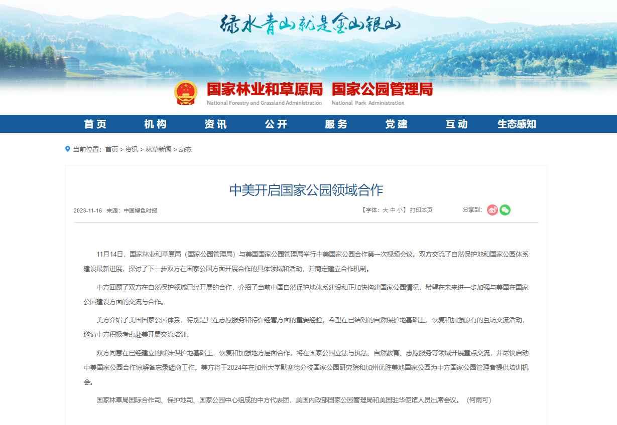 國家林業和草原局官網截圖 中方回顧了雙方在自然保護領域已經開展的合作,介紹了當前中國自然保護地體系建設和正加快構建國家公園情況,希望在未來進一步加強與美國在國家公園建設方面的交流與合作。 美方介紹了美國國家公園體系,特別是其在志願服務和特許經營方面的重要經驗,希望在已結對的自然保護地基礎上,恢復和加強原有的互訪交流活動,邀請中方積極考慮赴美開展交流培訓。 雙方同意在已經建立的姊妹保護地基礎上,恢復和加強地方層面合作,將在國家公園立法與執法、自然教育、志願服務等領域開展重點交流,並盡快啟動中美國家公園合作諒解備忘錄磋商工作。美方將於2024年在加州大學默塞德分校國家公園研究院和加州優勝美地國家公園為中方國家公園管理者提供培訓機會。 國家林草局國際合作司、保護地司、國家公園中心相關負責人,美國內政部國家公園管理局和美國駐華使館人員出席會議。 【編輯:丘志彬】
