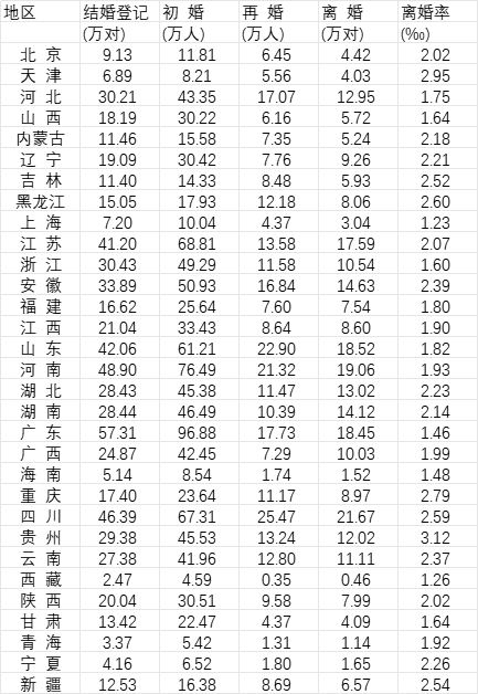 表:2022年31個省份結婚登記、初婚、再婚、離婚及離婚率數據(數據來源:《中國統計年鑒2023》) 【編輯:丘志彬】