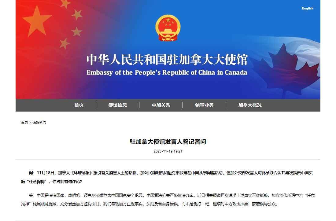 中國駐加拿大使館網站截圖 問:11月18日,加拿大《環球郵報》援引有關消息人士的話稱,加公民康明凱和邁克爾涉嫌在中國從事間諜活動。但加外交部發言人對此予以否認並再次指責中國實施“任意拘押”。你對此有何評論? 答:中國是法治國家,康明凱、邁克爾涉嫌危害中國國家安全犯罪,中國司法機關嚴格依法辦案。近日相關報道再次說明上述事實不容抵賴。加方炒作所謂中方“任意拘押”純屬賊喊捉賊,充分暴露加方虛偽面目。我們奉勸加方正視事實,深刻反省自身錯誤,而不是倒打一耙,繼續對中方攻擊抹黑,蒙蔽誤導公眾。 【編輯:丘志彬】
