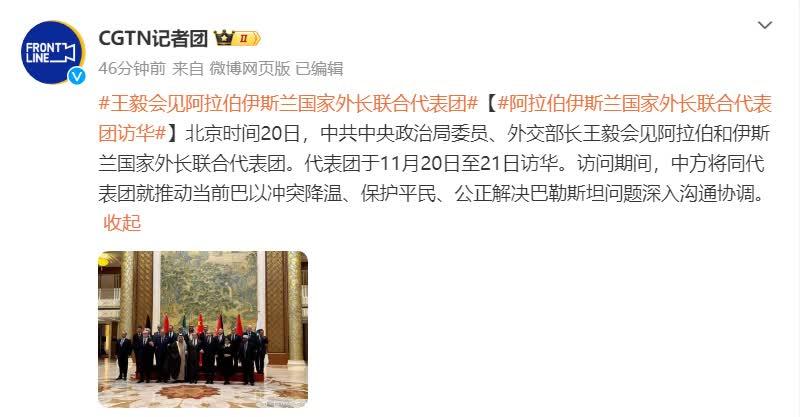 香港新聞網11月20日電 據CGTN記者團微博消息,北京時間20日,中共中央政治局委員、外交部長王毅會見阿拉伯和伊斯蘭國家外長聯合代表團。代表團於11月20日至21日訪華。訪問期間,中方將同代表團就推動當前巴以衝突降溫、保護平民、公正解決巴勒斯坦問題深入溝通協調。