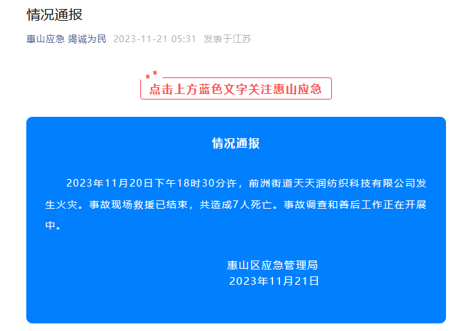 香港中通社11月21日電 據江蘇省無錫市惠山區應急管理局21日早間通報,20日18時30分許,前洲街道天天潤紡織科技有限公司發生火災,共造成7人死亡。